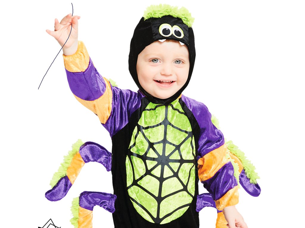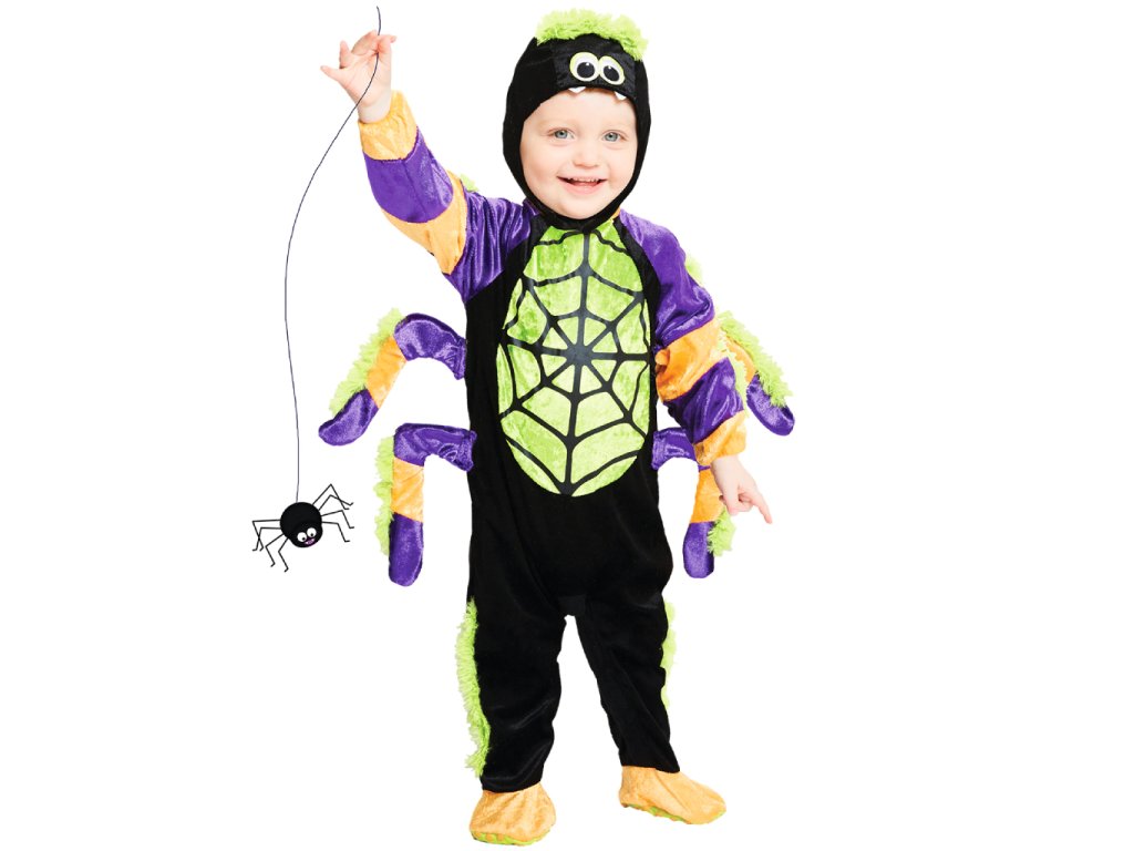 Dětský kostým Pavouk v černé barvě s barevnými prvky, overal má zapínání vzadu na suchý zip, zelené břicho s černou pavučinou doplňují barevné rukávy a pavoučí nohy, samostatná černá čepice s očima má zapínáním pod bradou, velikost 98-104 (3-4 roky). Balení obsahuje overal a čepici.
