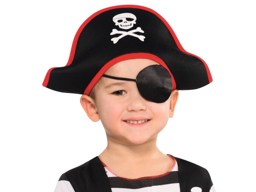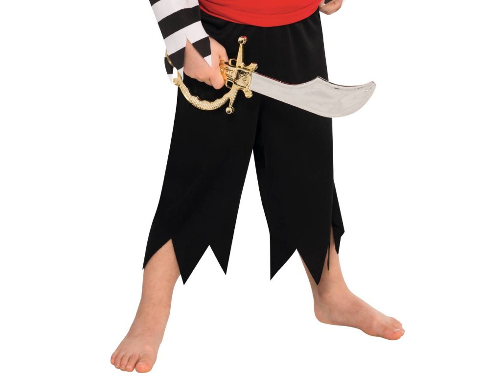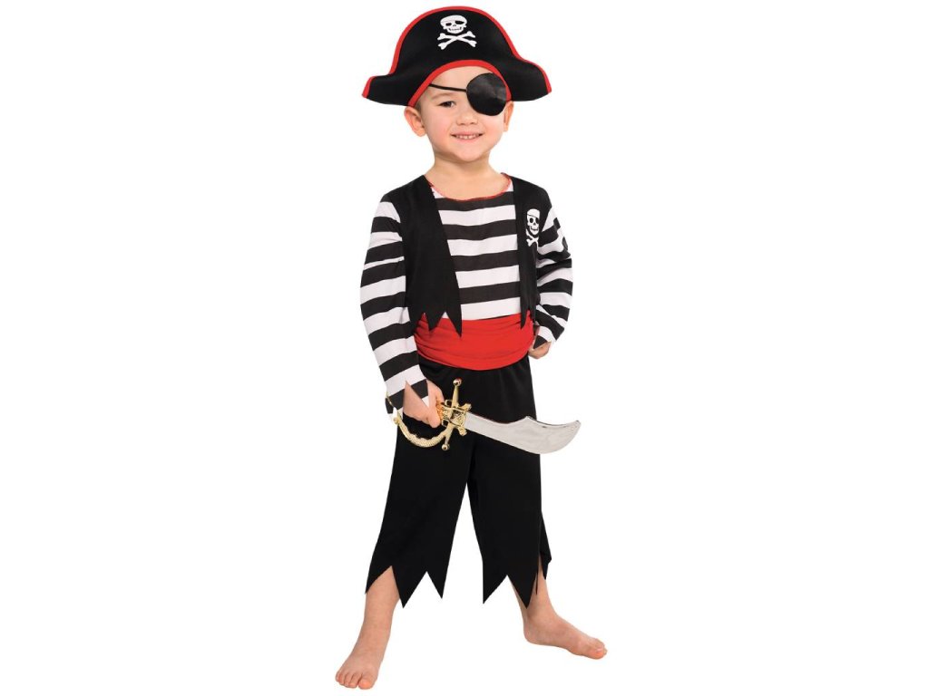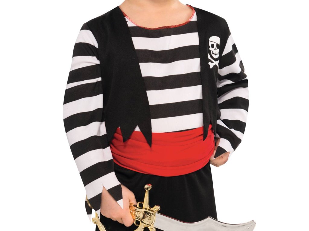 Dětský kostým Pirát tvoří overal s pruhovaným námořnickým vrškem, černou vestou, červeným páskem nad zkrácenými kalhotami s roztřepeným lemem a pirátský klobouk s potiskem lebky a zkřížených hnátů na přední straně, velikost 116-128 cm (6-8 let). Balení obsahuje overal a klobouk (šavle a páska přes oko nejsou součástí balení).