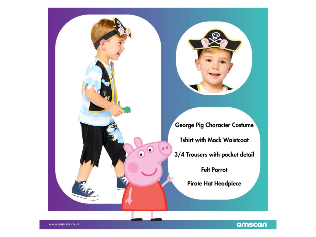 Dětský kostým Prasátko Peppa (Peppa Pig) - bratříček Tom (George) pirát tvoří pruhované triko s připevněnou vestou, kalhoty se zubatým okrajem a kapsou, plochý pirátský klobouk s elastickým páskem, 3D papoušek na vestě a 3D dinosaurus v kapse, velikost 104-116 (4-6 let). Balení obsahuje triko s vestou, kalhoty, klobouk, papouška a dinosaura.