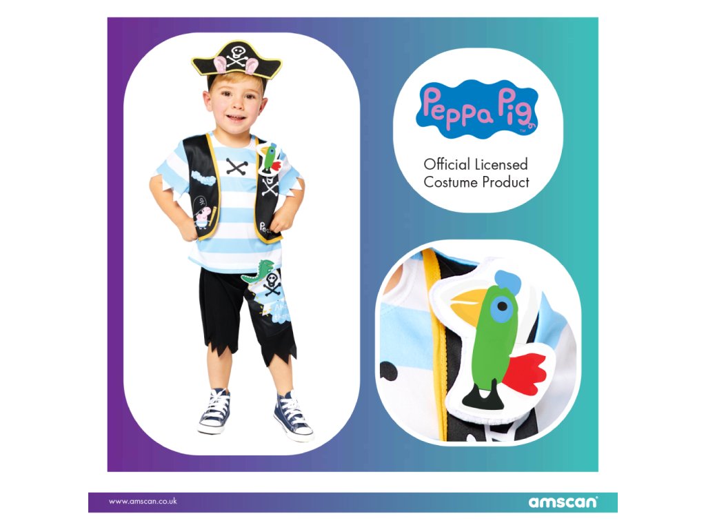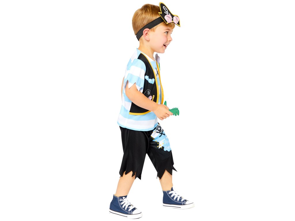 Dětský kostým Prasátko Peppa (Peppa Pig) - bratříček Tom (George) pirát tvoří pruhované triko s připevněnou vestou, kalhoty se zubatým okrajem a kapsou, plochý pirátský klobouk s elastickým páskem, 3D papoušek na vestě a 3D dinosaurus v kapse, velikost 98-104 (3-4 roky). Balení obsahuje triko s vestou, kalhoty, klobouk, papouška a dinosaura.