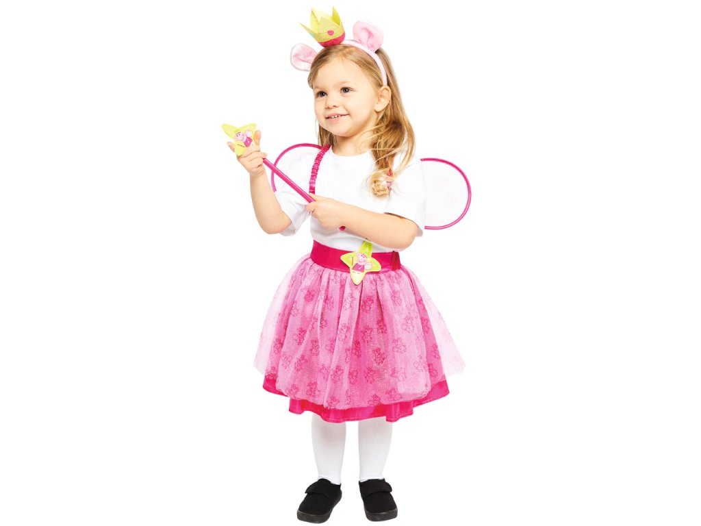 Dětský kostým Prasátko Peppa (Peppa Pig) vílí princezna tvoří růžová tutu sukýnka s ocáskem na zadní straně, křídla, hůlka a čelenka s oušky a korunkou. Hůlka, křídla a sukně na přední straně jsou zdobené žlutou hvězdou s obrázkem Peppy, velikost 98-104 (3-4 roky). Balení obsahuje sukni, hůlku, křídla a čelenku (triko a punčochy nejsou součástí balení).