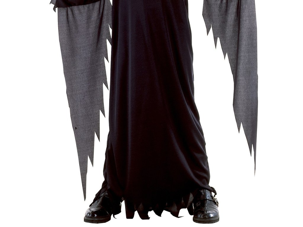 Dětský kostým ve stylu Scary Movie (parodie na film Vřískot) v černé barvě s pilovitě zubatými okraji, širokými rukávy a bílou maskou s černou kapucí, velikost/výška postavy 130-140 cm (9-10 let). Celková délka: 105 cm, šířka v pase: 45 cm, délka rukávu: 44 cm. Balení obsahuje hábit a masku s kapucí (rukavice nejsou součástí balení).