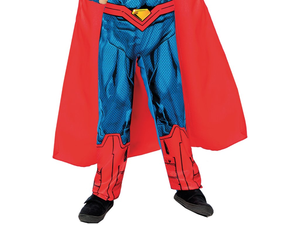 Dětský kostým Superman v červeno-modré barvě tvoří dlouhý červený plášť a overal s celoplošným potiskem, velikost 116-128 cm (6-8 let). Balení obsahuje overal a dlouhý plášť.