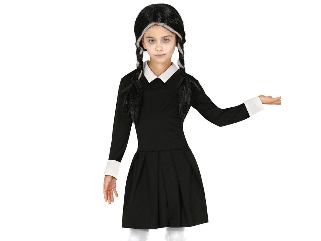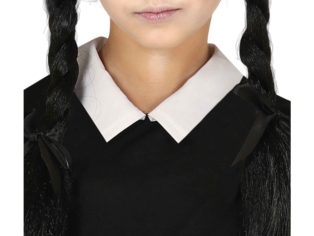 Dětský kostým Temná dívka ve stylu postavy Wednesday z Addamsovy rodiny, gotické černé šaty s bílým límečkem a lemy na rukávech, velikost 140-152 (10-12 let). Paruka není součástí balení.