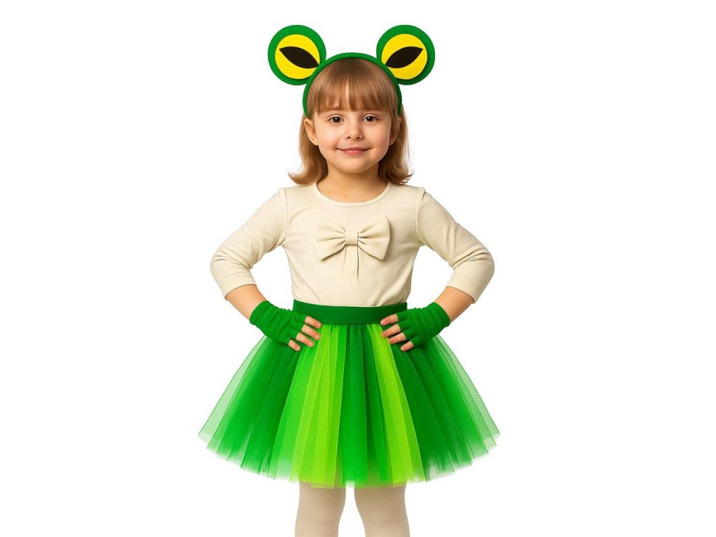 Proměňte se v nejveselejší žabku na karnevalu. Tento stylový set kombinuje nadýchanou tylovou sukýnku v odstínech svěží trávy, rukavice a originální čelenku s velkýma žabíma očima. Kostým je navržen tak, aby byl nejen roztomilý, ale také maximálně pohodlný. Ideální pro malé slečny, které nebaví jen sedět na leknínu, ale chtějí protančit celý den!
