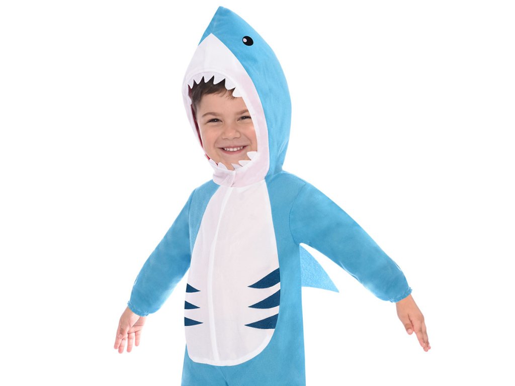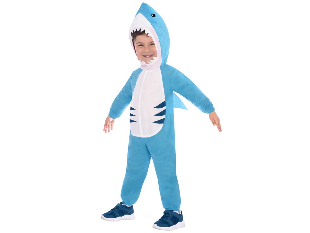 Dětský kostým Žralok v modré barvě, jednodílný overal má pružné lemy na zápěstích a kotnících, připevněnou kapuci ozdobenou bílými plstěnými zoubky, ploutev na zádech a na přední straně zip, velikost 116-128 cm (6-8 let). Ošetření textilu: ruční praní ve studené vodě, sušení na šňůře.