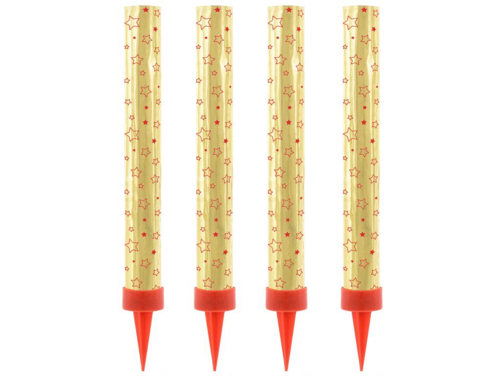 Párty fontány na dort ve zlaté barvě s červenými hvězdami, výška 12 cm, v balení 4 ks.