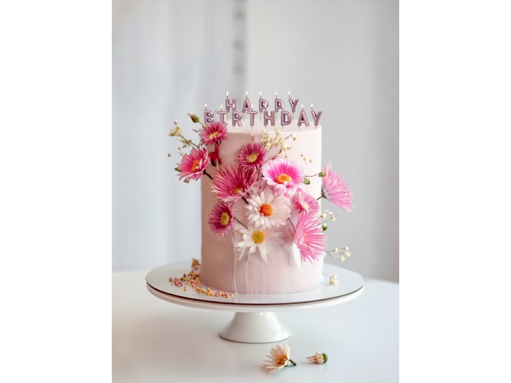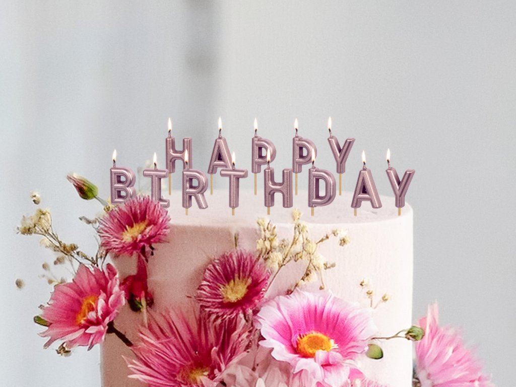 Narozeninové svíčky HAPPY BIRTHDAY v růžově zlaté barvě, výška písmen 2,5 cm, celková výška vč. dřevěného zápichu 7 cm.
