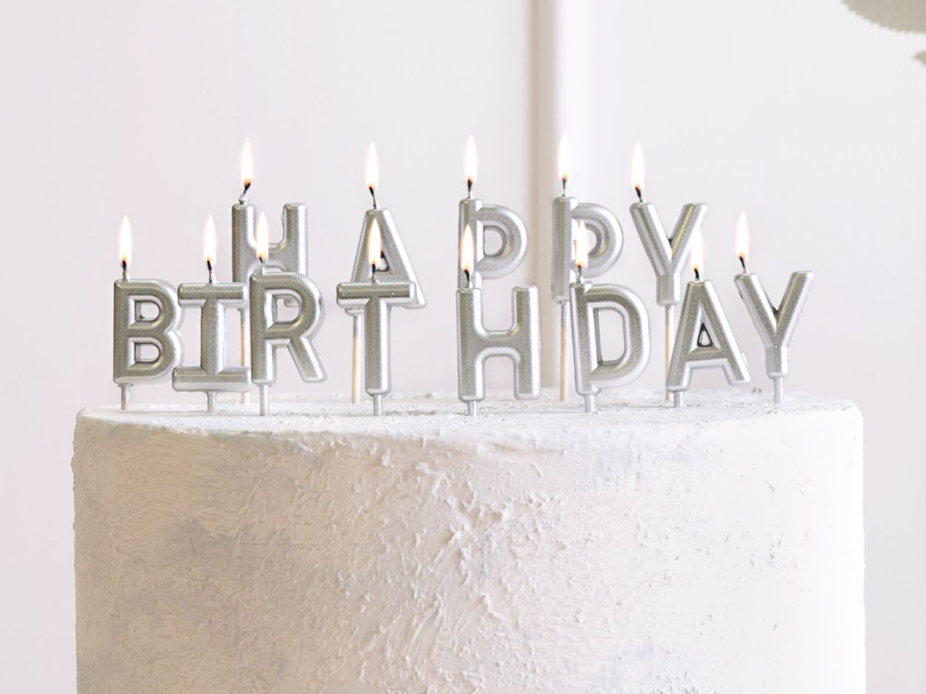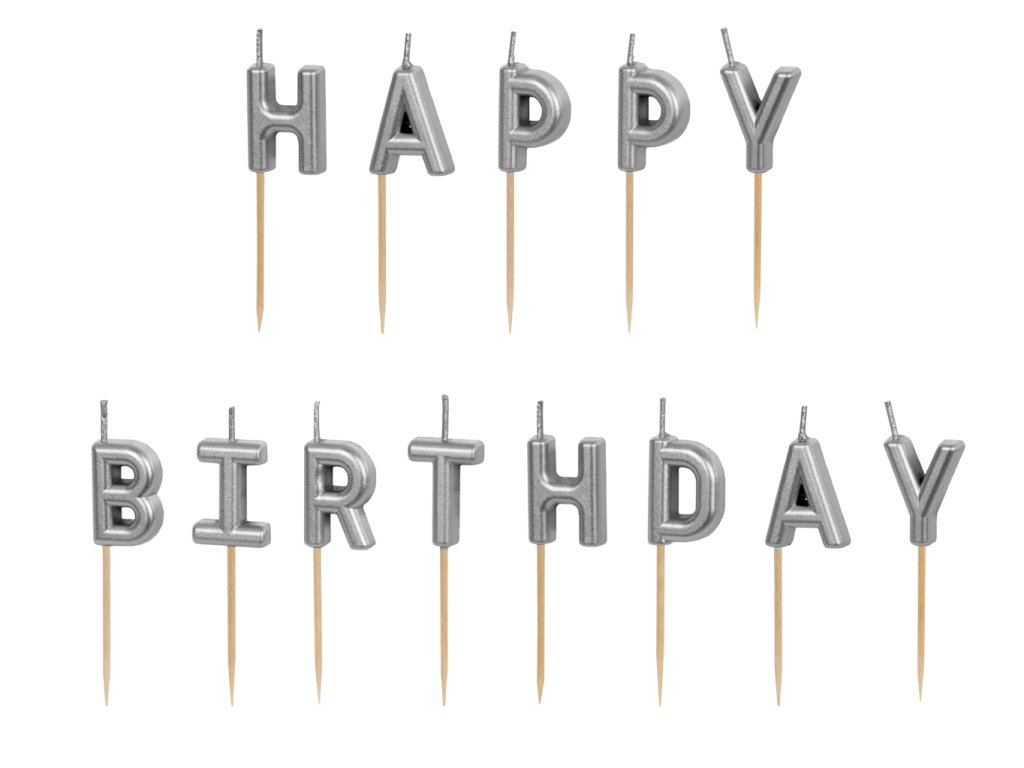 Narozeninové svíčky HAPPY BIRTHDAY ve stříbrné barvě, výška písmen 2,5 cm, celková výška vč. dřevěného zápichu 7 cm.