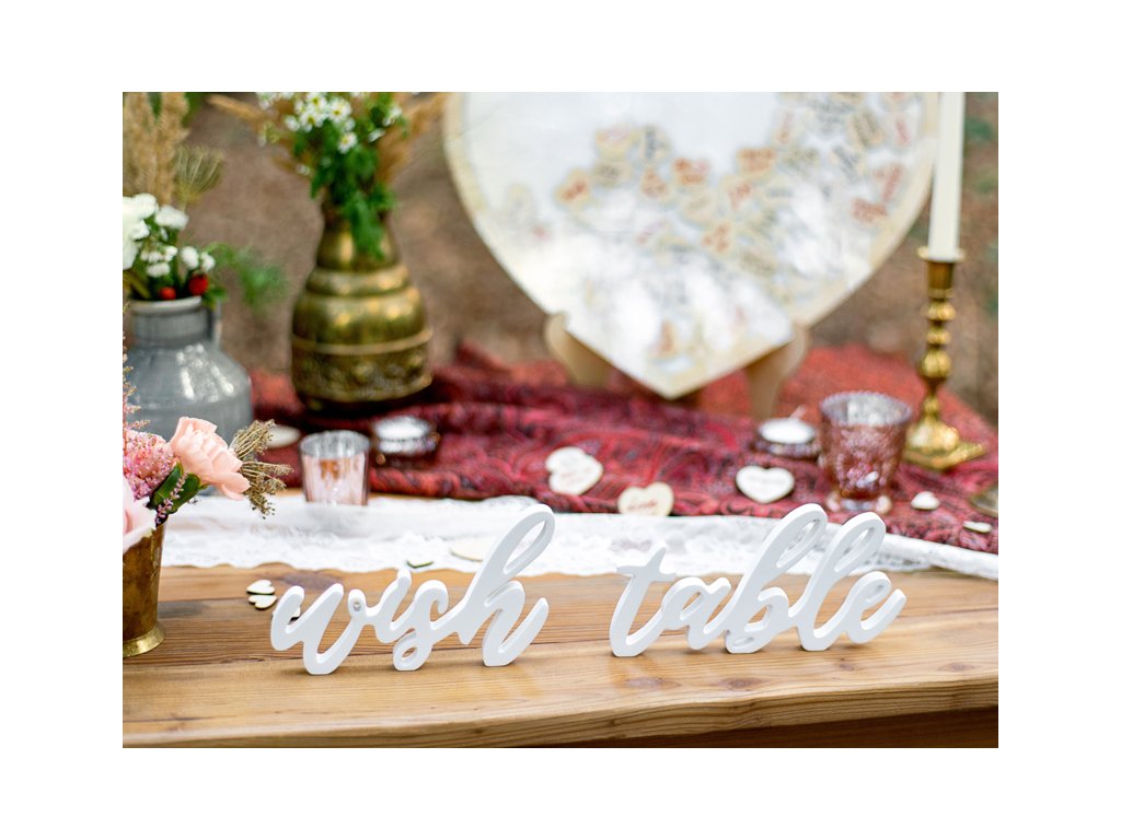Dřevěný nápis wish table v bílé barvě, velikost 40 x 10 cm.