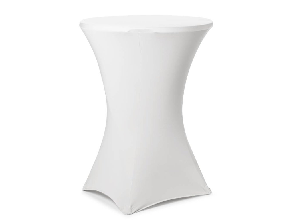 Elastický ubrus v bílé barvě na kulatý koktejlový nebo barový stůl, průměr 80 cm, výška 110 cm.