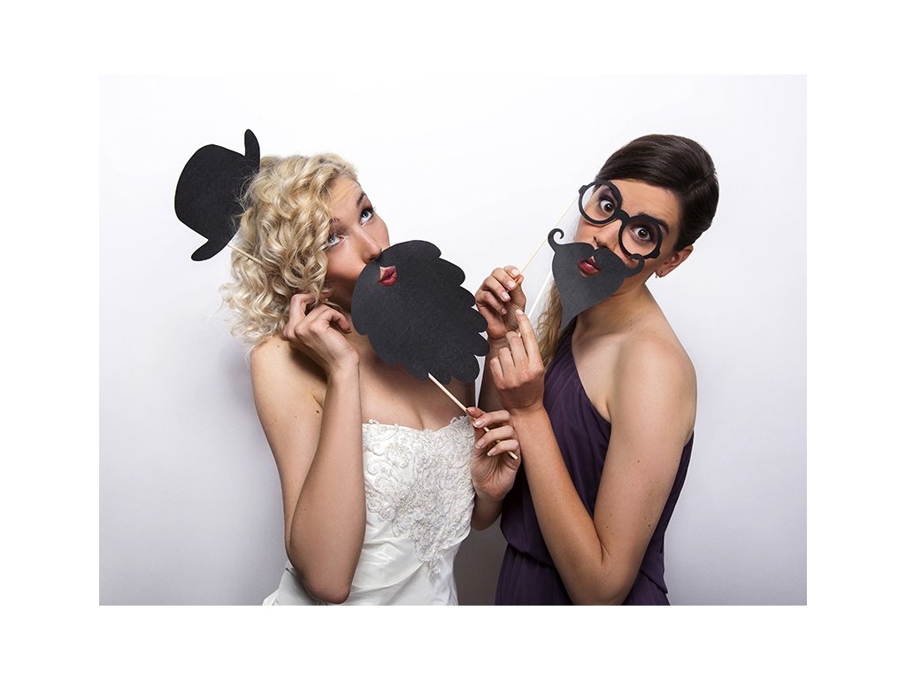 Sada rekvizit do fotokoutku Gentleman obsahuje dlouhé vousy, krátké vousy s knírem, brýle a klobouk, materiál papír/dřevo, v balení 4 ks.