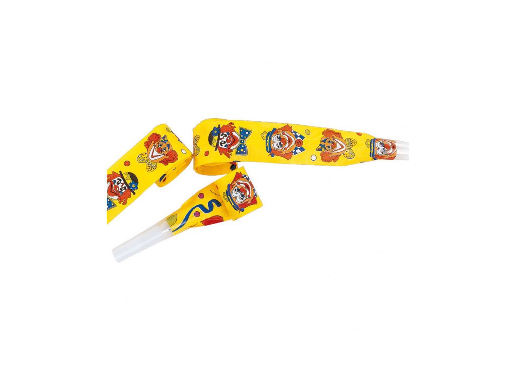 Frkačky Klaun ve žluté barvě s barevným potiskem, materiál papír/plast, délka 30 cm, v balení 4 ks.