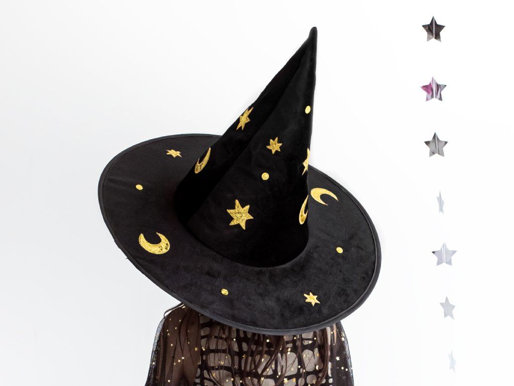 Proměňte se v postavu z fantasy příběhů s tímto stylovým čarodějnickým kloboukem. Díky svému hlubokému černému odstínu a zářivým zlatým motivům noční oblohy je tento klobouk nepřehlédnutelným kouskem, který dodá každému kostýmu nádech skutečného kouzla a tajemna.