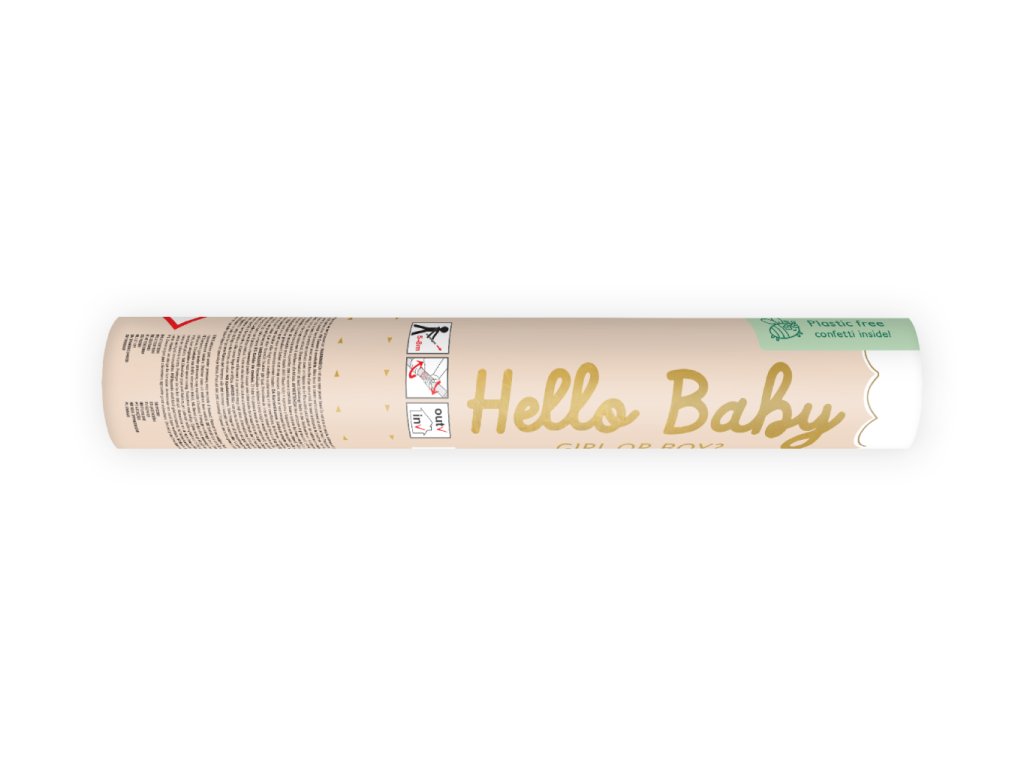 Vystřelovací konfety Hello Baby k odhalení pohlaví s nápisem Boy or Girl (chlapec nebo dívka), z tuby vyletí papíroví motýlci ve třech odstínech růžové barvy, dostřel 5-8 m, velikost tuby 20 cm. Funguje na stlačený vzduch.
