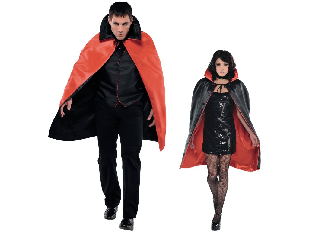 Kostým unisex pro dospělé a náctileté Čertovský nebo Upíří plášť saténový oboustranný - 1. strana černá, 2. strana červená. Pláštěnka má nastavitelný límec a zapíná se černou šňůrkou, jednotná velikost.