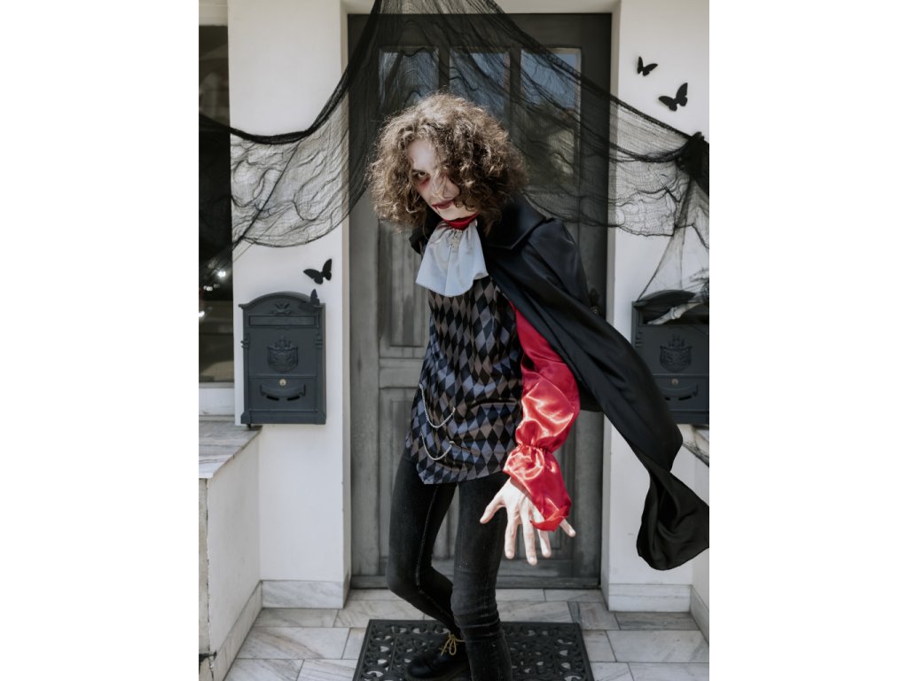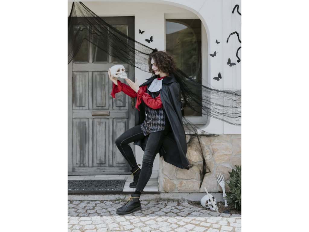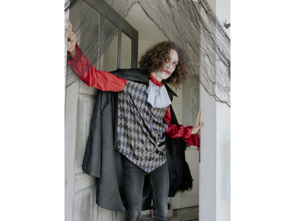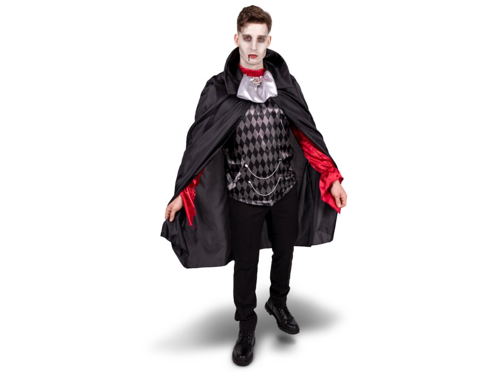 Pánský kostým Dracula v černé a červené barvě, velikost L-XL (52-54), materiál polyester, ošetření textilu: ruční praní. Balení obsahuje plášť a košili.