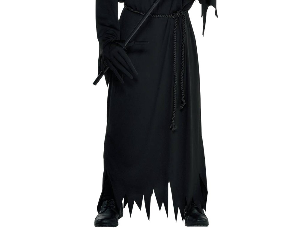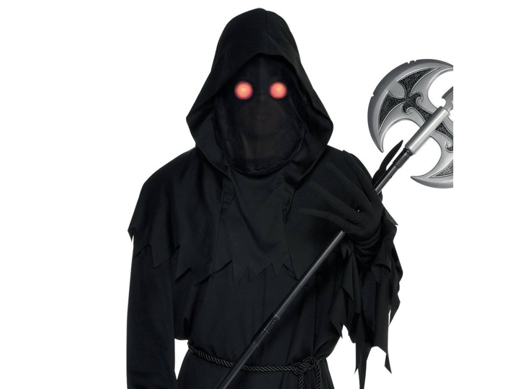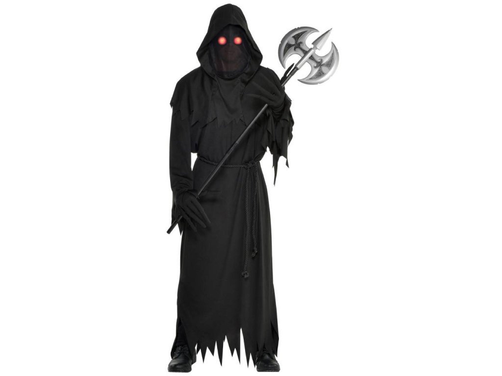 Kostým unisex Duch temnoty/smrtka v černé barvě s pilovitě zubatými okraji, širokými rukávy, kapucí a maskou s LED svítícíma očima, velikost M-L (50-52). Balení obsahuje hábit, textilní pásek, rukavice a masku s LED světlem (sekera a baterie nejsou součástí balení).