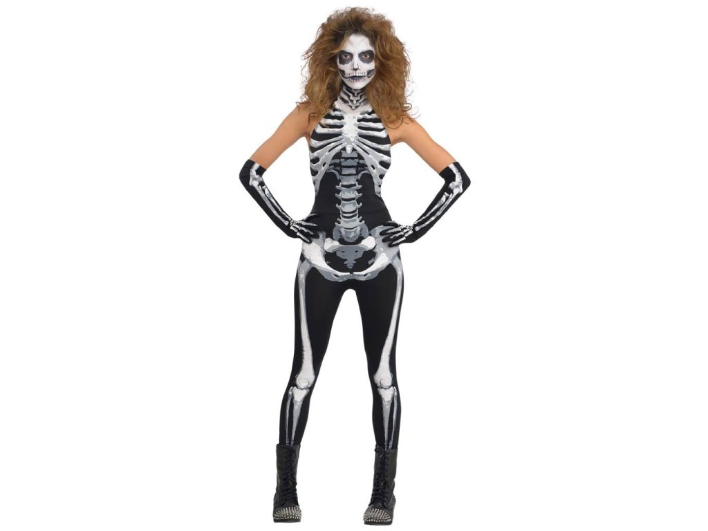 Dámský kostým Kostlivec v černé barvě s bílým potiskem na přední straně, velikost S (36), balení obsahuje overal a rukavice.