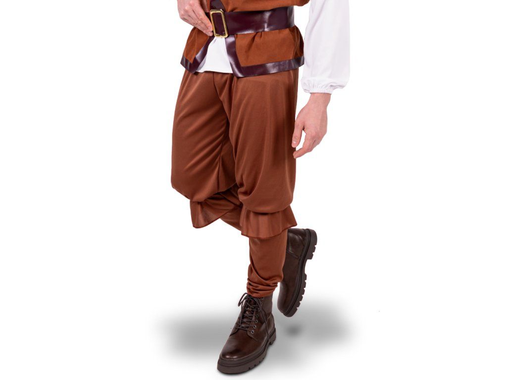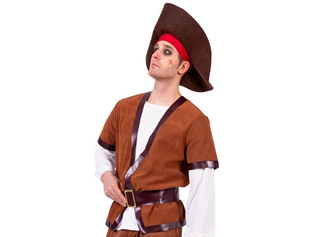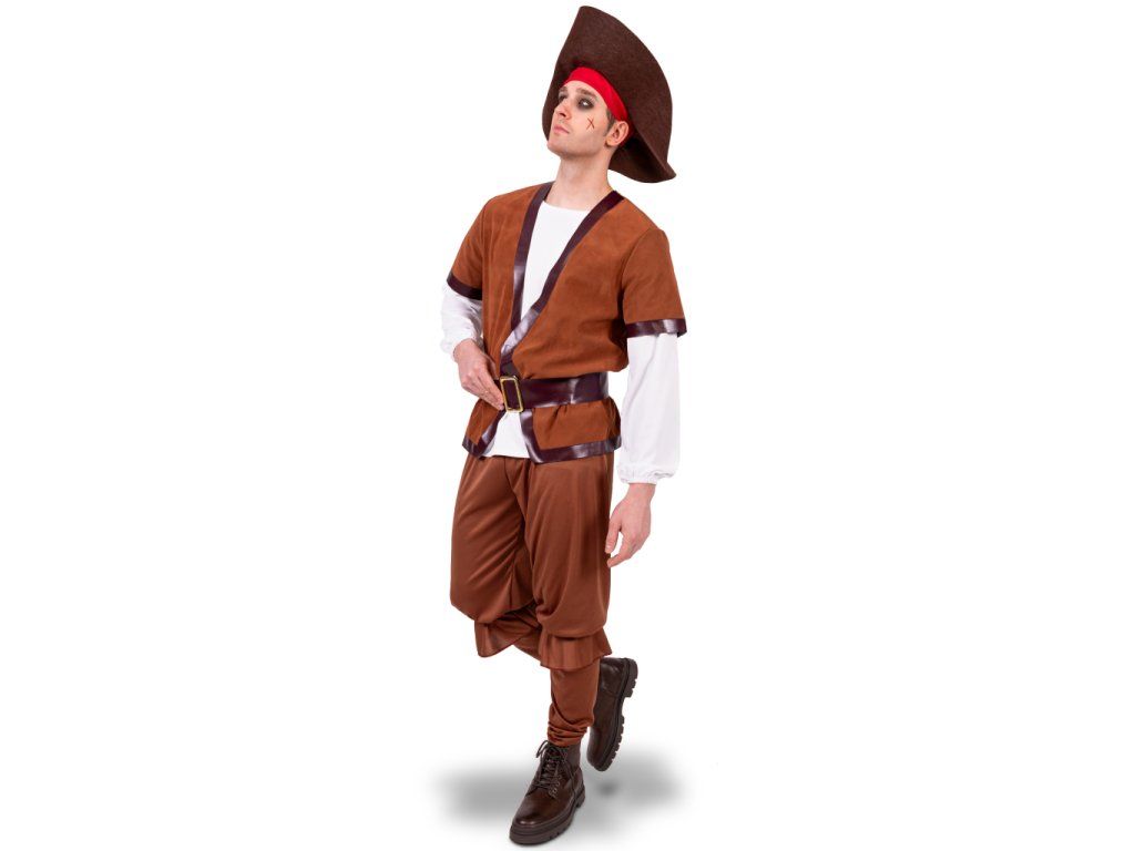 Kostým kombinuje kontrastní bílou košili s hnědou vestou a kalhotami v rustikálním stylu, což dodává převleku ten správný historický nádech a pirátský šmrnc.