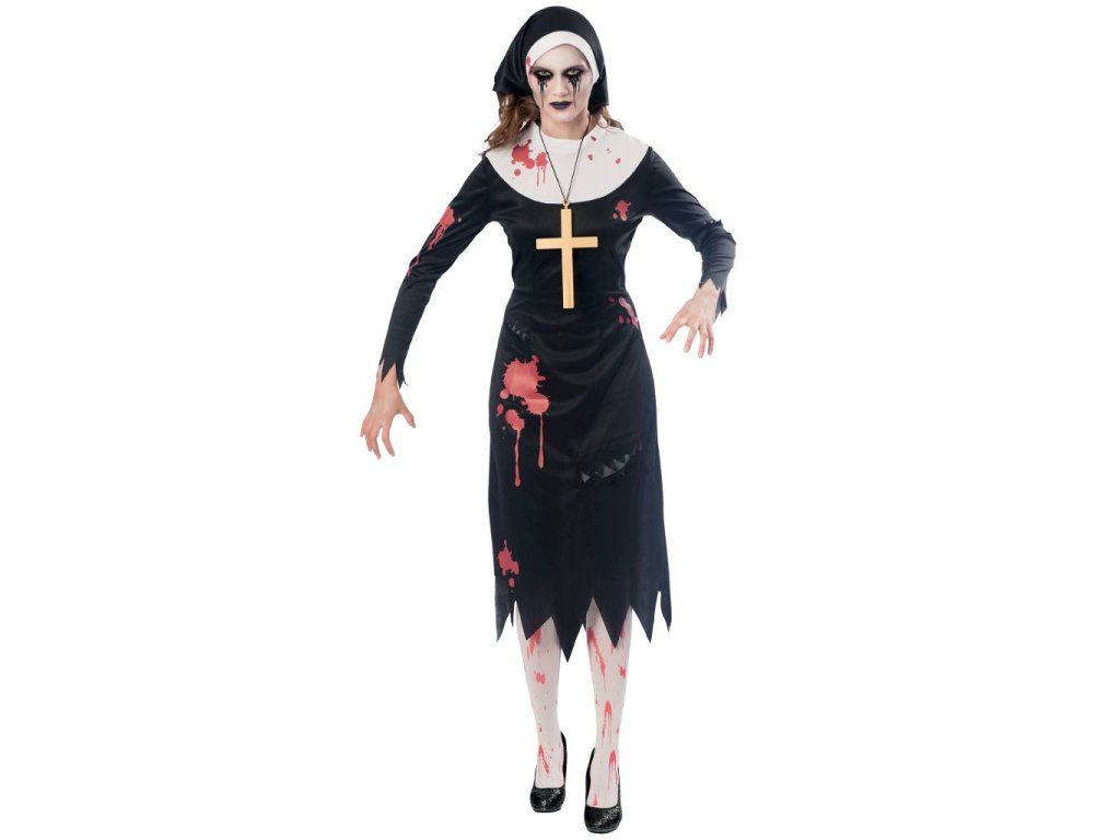 Dámský kostým Zombie jeptiška v černé barvě s bílými prvky a krvavými skvrnami, velikost M-L (38-40). Balení obsahuje šaty (hábit), čepec a kříž (punčochy nejsou součástí balení).