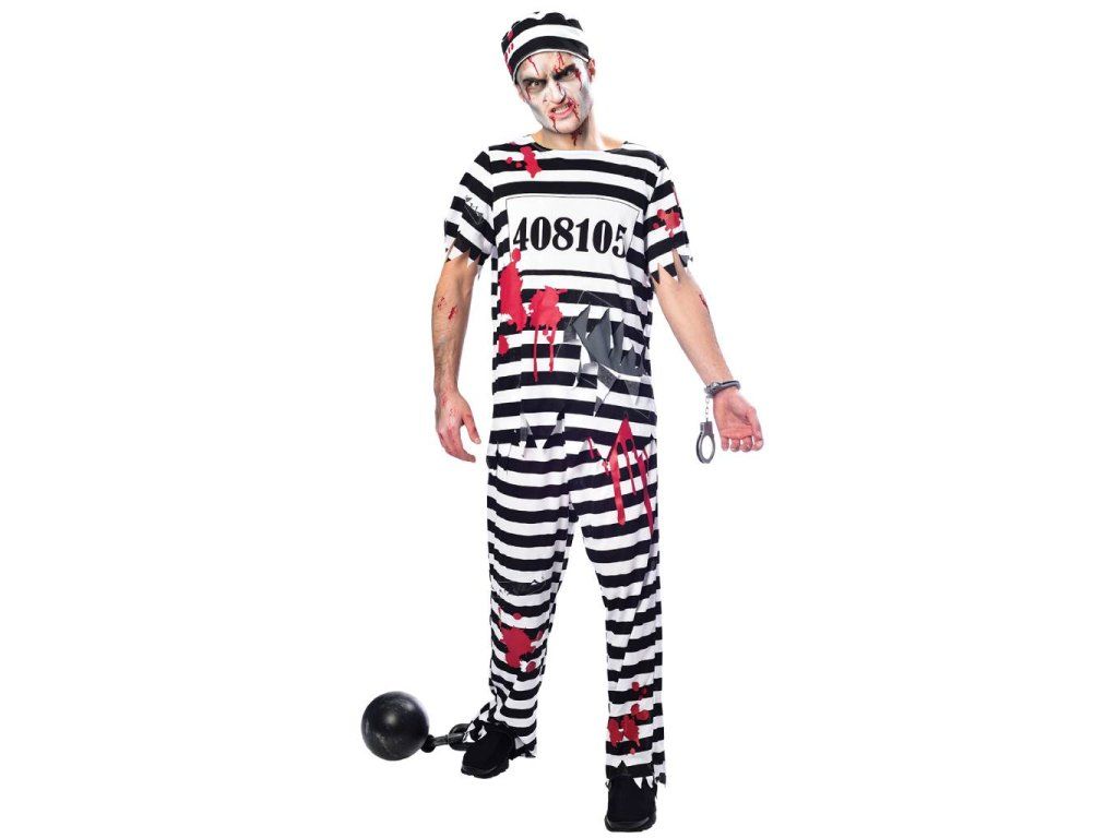 Pánský kostým Zombie trestanec v černo-bílé barvě, materiál polyester, velikost L (52). Balení obsahuje triko, kalhoty a čepici (koule a pouta nejsou součástí balení).
