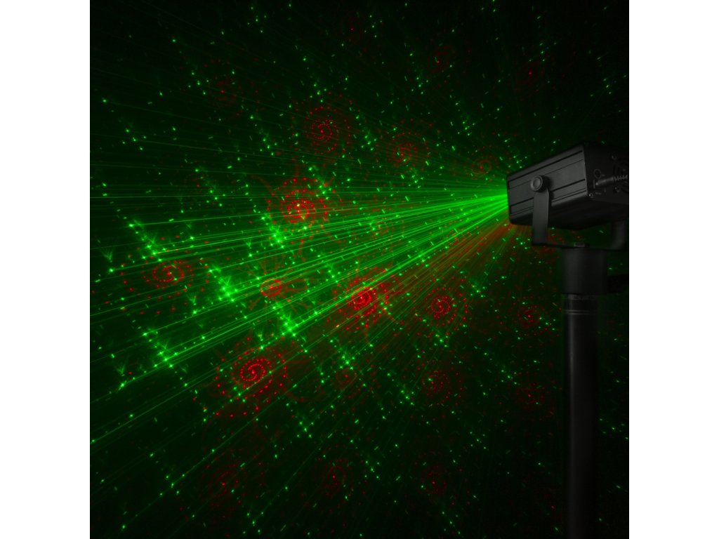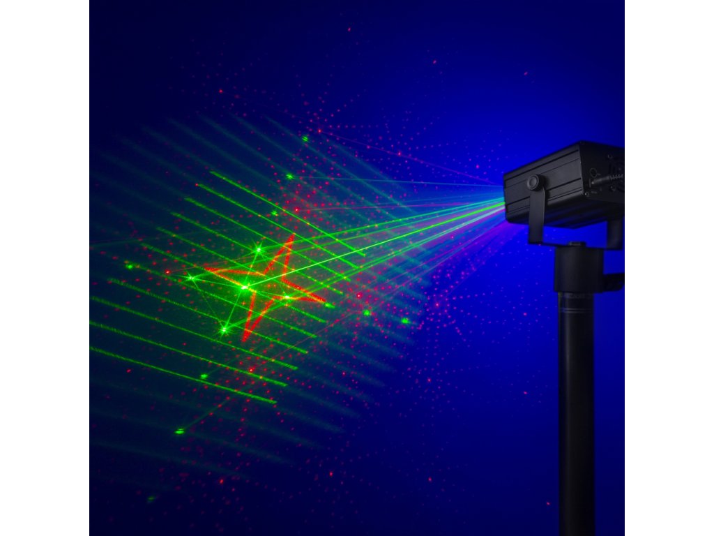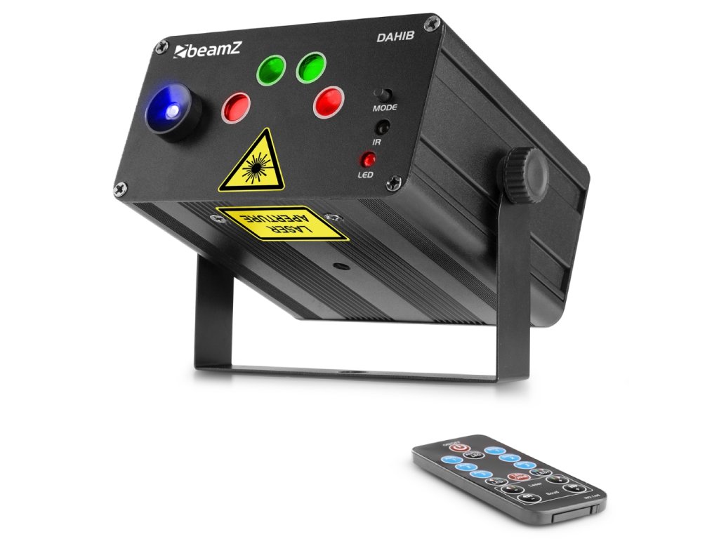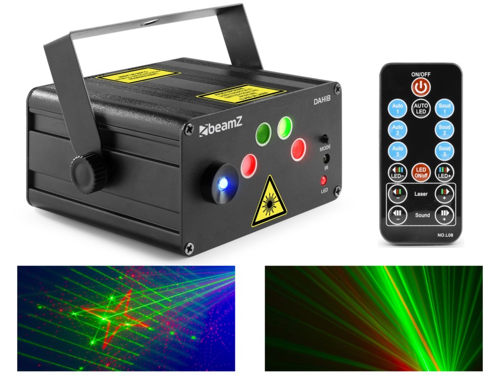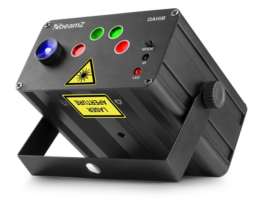 Dvojitý laserový systém BeamZ Dahib Double RG Gobo je kompaktní laserový projektor o hmotnosti 0,55 g. Zařízení je vhodné pro osvětlení diskoték, večírků, plesů a dalších akcí, zkrátka všude tam, kde je třeba oživit atmosféru působivou světelnou show. V jeho jádru se skrývají dva lasery – jeden červený s výkonem 100 mW a jeden zelený s výkonem 50 mW. K dispozici je také jedna modrá LED dioda, která vám umožní nechat laserové efekty pořádně vyniknout.