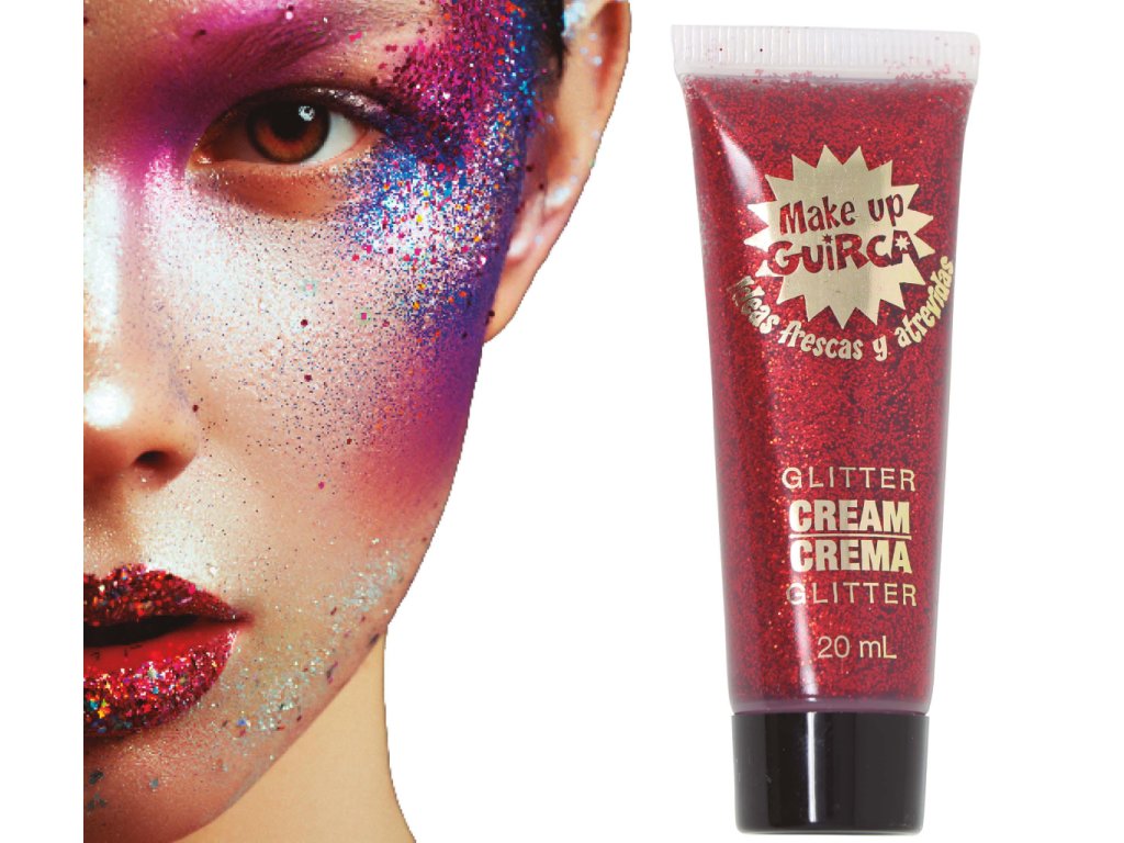 Karnevalový make-up gelová barva na obličej v tubě s červenými třpytkami, obsah 20 ml.