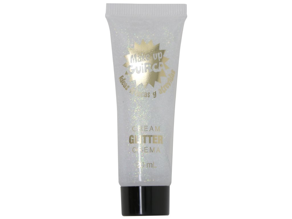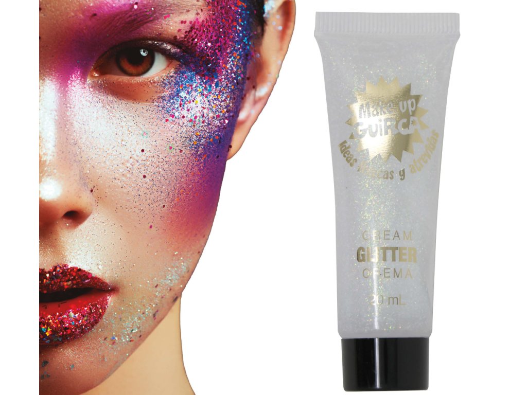 Karnevalový make-up gelová barva na obličej v tubě s iridescentními třpytkami (hrající duhovými barvami), obsah 20 ml.