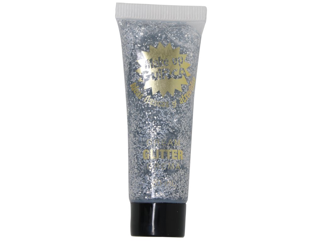 Karnevalový make-up gelová barva na obličej v tubě se stříbrnými třpytkami, obsah 20 ml.
