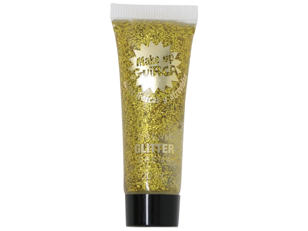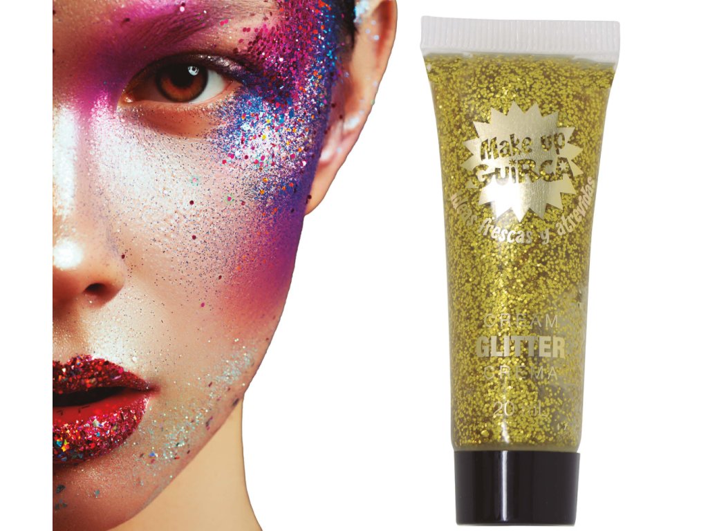 Karnevalový make-up gelová barva na obličej v tubě se zlatými třpytkami, obsah 20 ml.