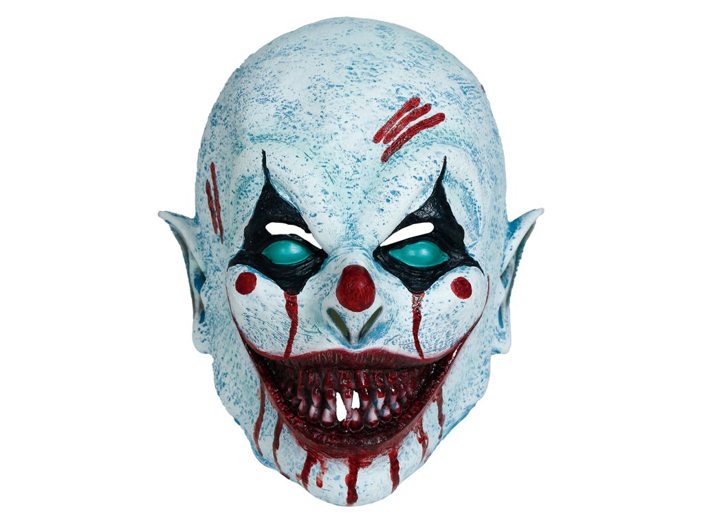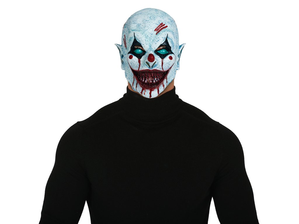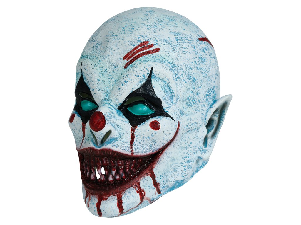 Navlékací latexová maska na hlavu Klaun v bílo-modré barvě s krvavými zuby.