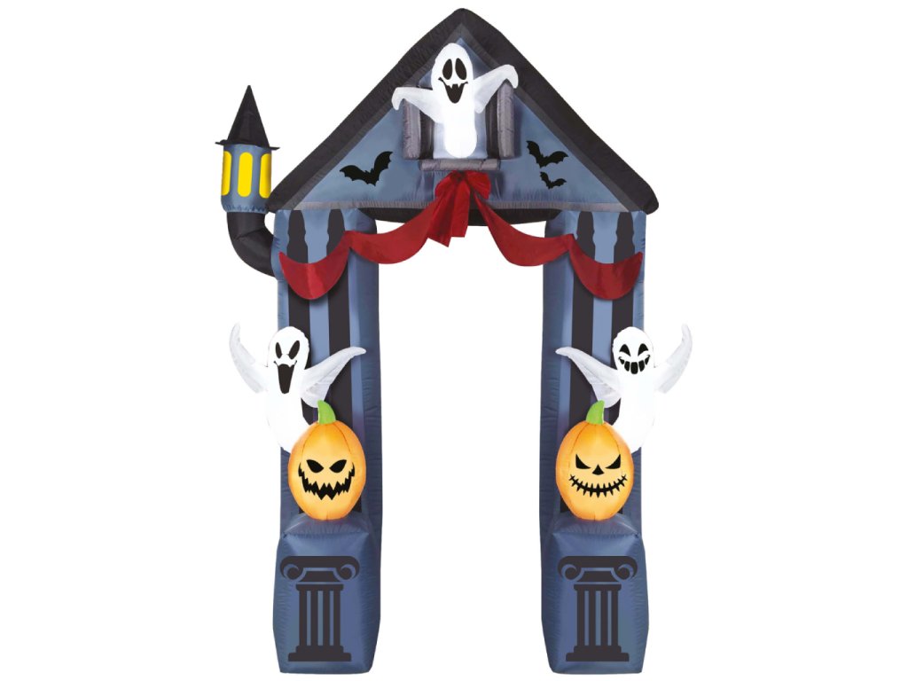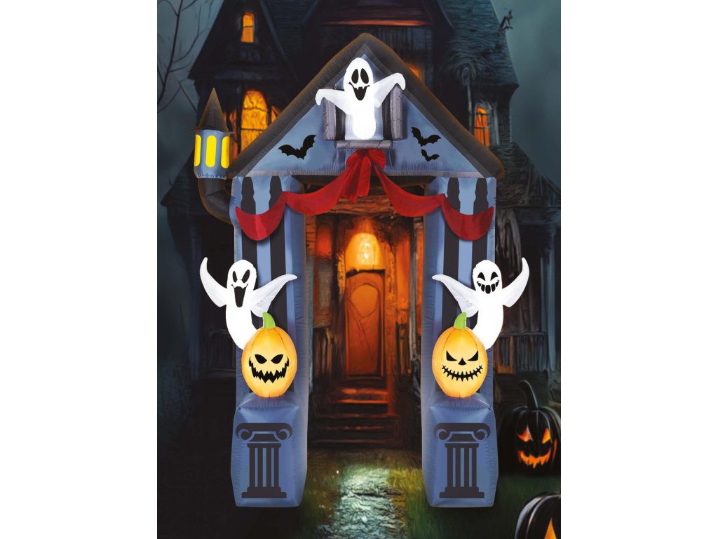 Halloweenská dekorace šedá nafukovací brána Duchové, velikost 240 x 200 cm. Tato nafukovací atrakce vám pomůže dokreslit atmosféru temnoty a tajemna při oslavě svátku Halloween či jiné strašidelné slavnosti.