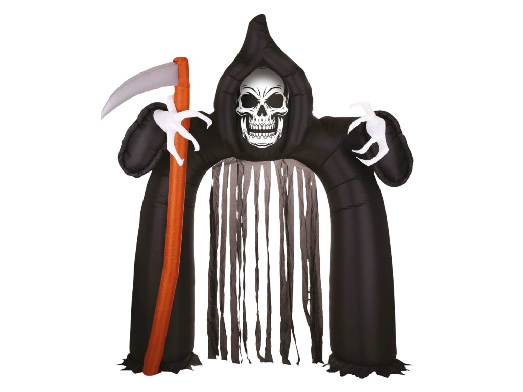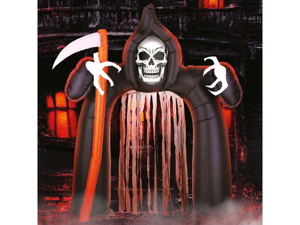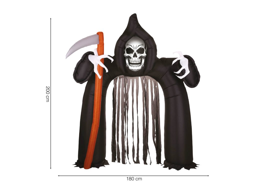 Halloweenská dekorace černá nafukovací brána se závěsem Smrtka s kosou, velikost 200 x 180 cm. Tato nafukovací atrakce vám pomůže dokreslit atmosféru temnoty a tajemna při oslavě svátku Halloween či jiné strašidelné slavnosti.