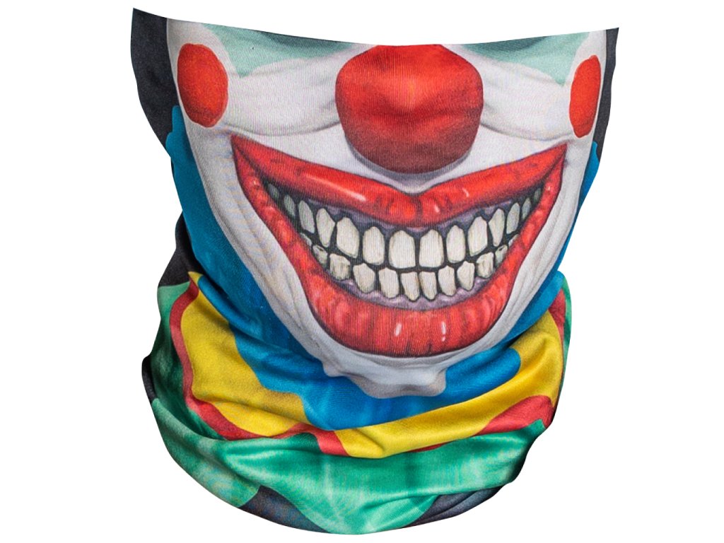 Nákrčník s maskou Klaun zakrývající spodní polovinu obličeje, zatímco oči zůstávají odkryté. Tenká černá látka je potištěna strašidelným klaunským vzorem s červeným nosem a děsivým úšklebkem s vyceněnými zuby, velikost universální (pro dospělé).