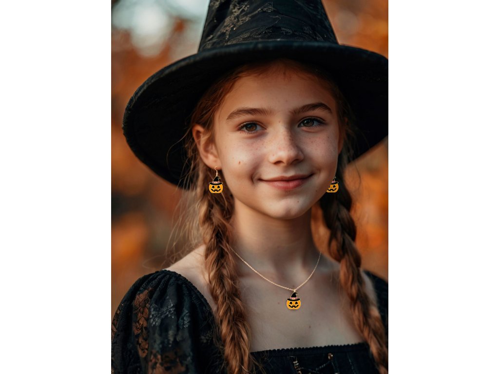 Halloweenský set náušnice a náhrdelník Dýně v oranžové barvě, materiál kov, balení obsahuje 1 pár náušnic a 1 náhrdelník.