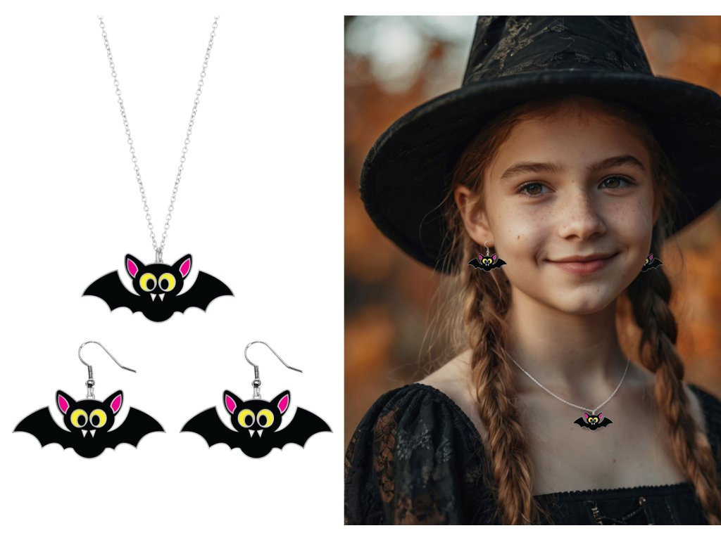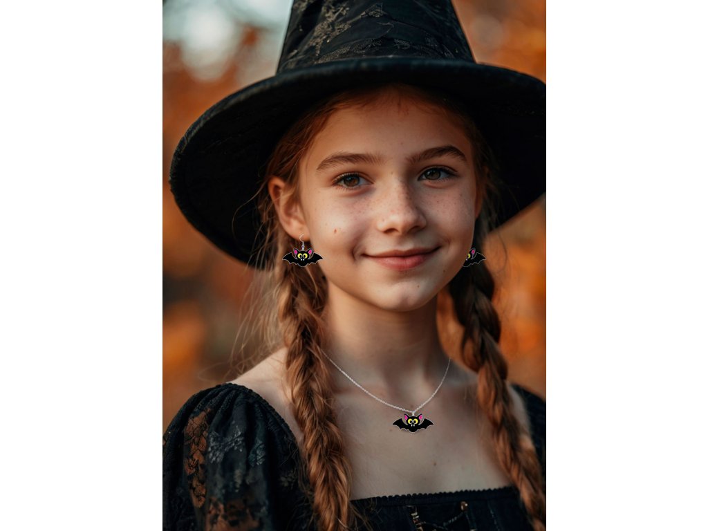 Halloweenský set náušnice a náhrdelník Netopýr v černé barvě, materiál kov, balení obsahuje 1 pár náušnic a 1 náhrdelník.