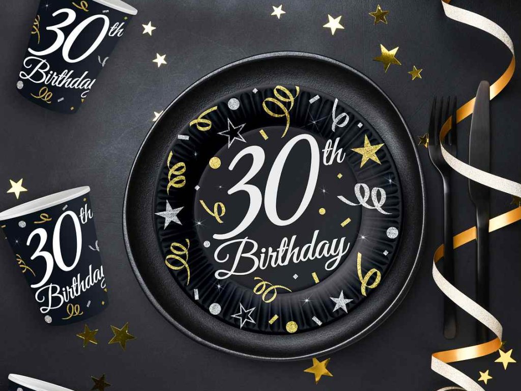 Papírové kelímky černo-zlaté s číslem 30 z kolekce Beauty&Charm, objem 250 ml, v balení 6 ks.