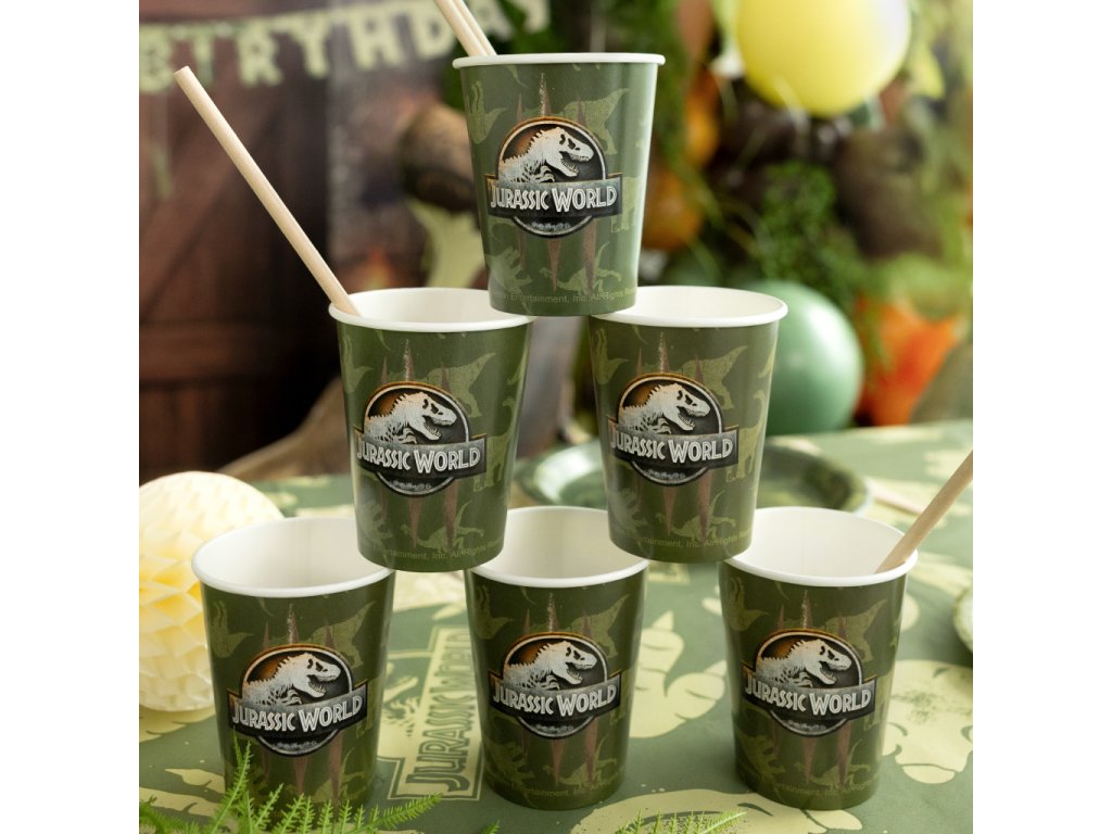 Papírové kelímky s motivem Jurský svět (Jurassic World) v zelené barvě s logem a potiskem, objem 250 ml, v balení 6 ks.