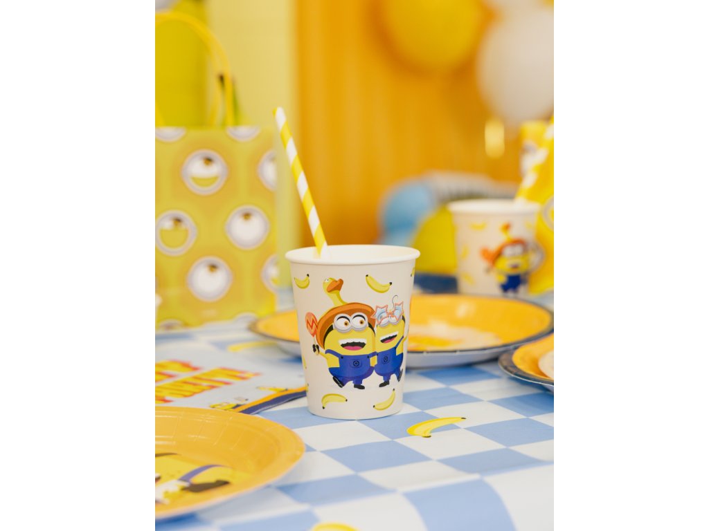Pozvěte na oslavu ty nejveselejší parťáky! Tyto papírové kelímky s motivem rozesmátých Mimoňů v párty doplňcích dodají každému doušku tu pravou dávku humoru. Na jemném krémovém pozadí se prohánějí žlutí uličníci s banány, balonky a vtipnými brýlemi ve tvaru hvězd, což z nich dělá naprosto nepřehlédnutelný doplněk vaší narozeninové tabule.