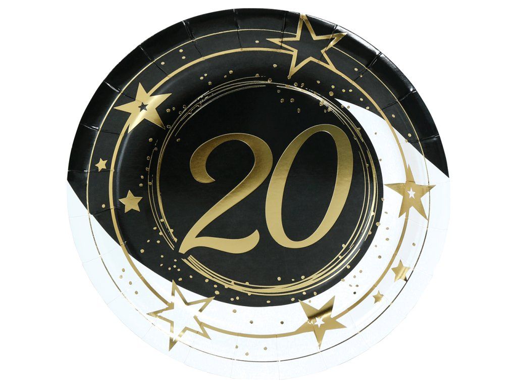 Dvacáté narozeniny jsou velkým milníkem, který si zaslouží hostinu ve velkém stylu. Naše papírové talířky s motivem "20" jsou stvořeny pro každou pořádnou narozeninovou jízdu. Elegantní černo-bílý podklad dává vyniknout zlatým detailům a hvězdnému prachu, což z nich dělá perfektní základ pro stylové servírování dortu i slaného pohoštění.