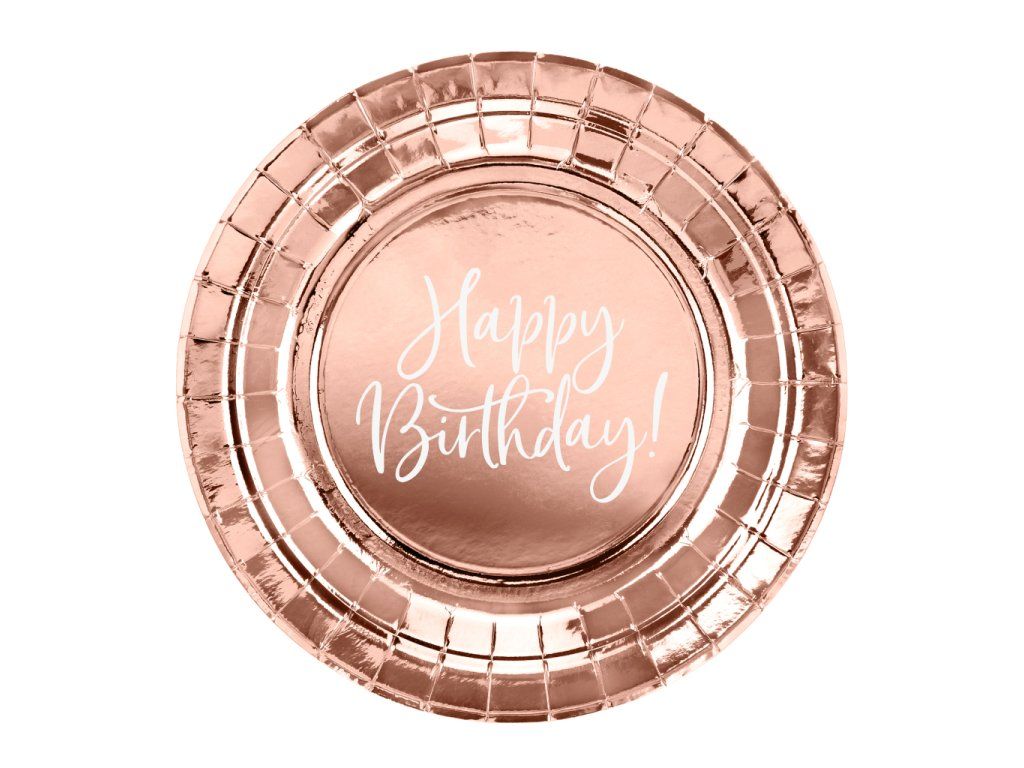 Papírové talířky v metalické růžově zlaté (Rose Gold) barvě s bílým nápisem Happy Birthday, velikost 18 cm, v balení 6 ks.