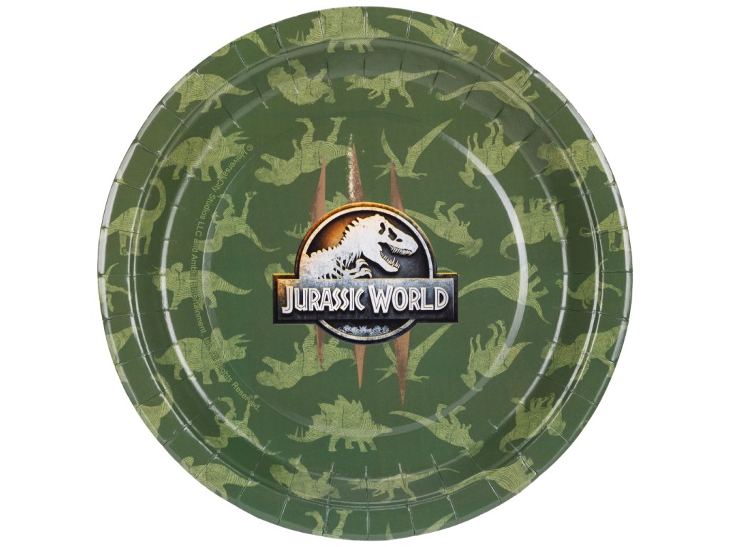 Připravte se na hostinu přímo v srdci dinosauřího parku! Tyto papírové talířky Jurský svět s propracovaným maskáčovým designem jsou tím pravým základem pro každé dravé občerstvení. Na olivově zeleném pozadí se skrývají siluety legendárních dinosaurů, jako jsou Triceratops, Stegosaurus nebo Pteranodon, zatímco středu dominuje nezaměnitelné stříbrné logo Jurassic World se stopami po ostrých drápech.