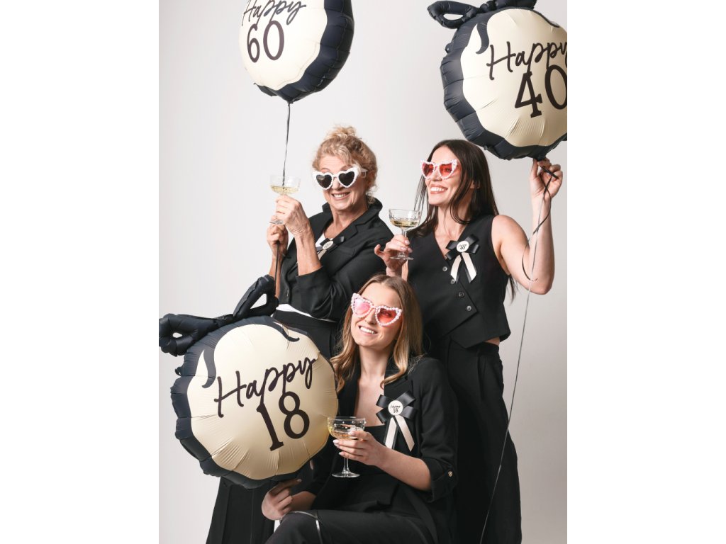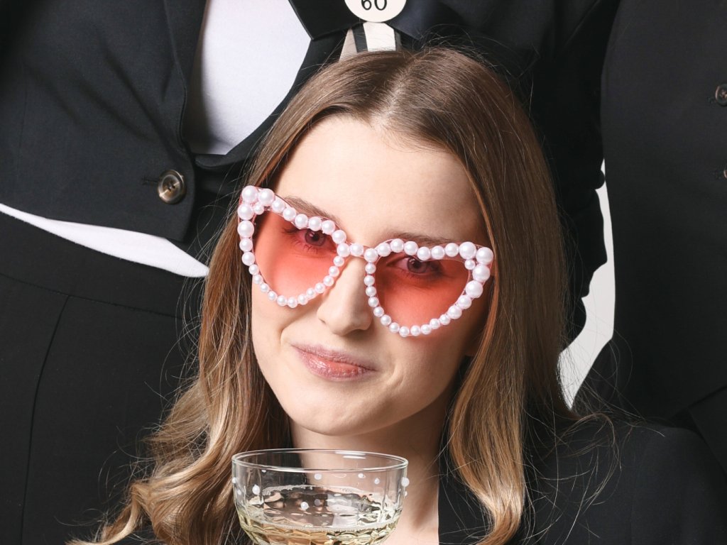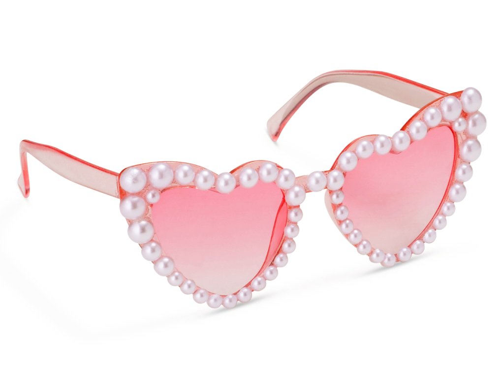 Plastové párty brýle ve tvaru srdce v růžové barvě s bílými perlami, velikost obruby: šířka 13,5 cm, výška 5 cm, délka stanice (nožičky) 13 cm.