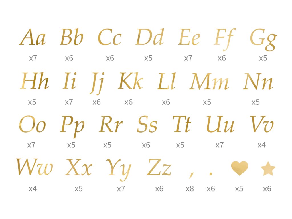 Papírové samolepky na balonky písmena metalická zlatá, sada obsahuje 5 archů s písmeny - počet jednotlivých písmen uveden na obrázku, 5x srdíčko, 6x hvězdička, 8x čárka, 6x tečka. Velikost archu 21 x 29,7 cm, výška písmene cca 7 cm.