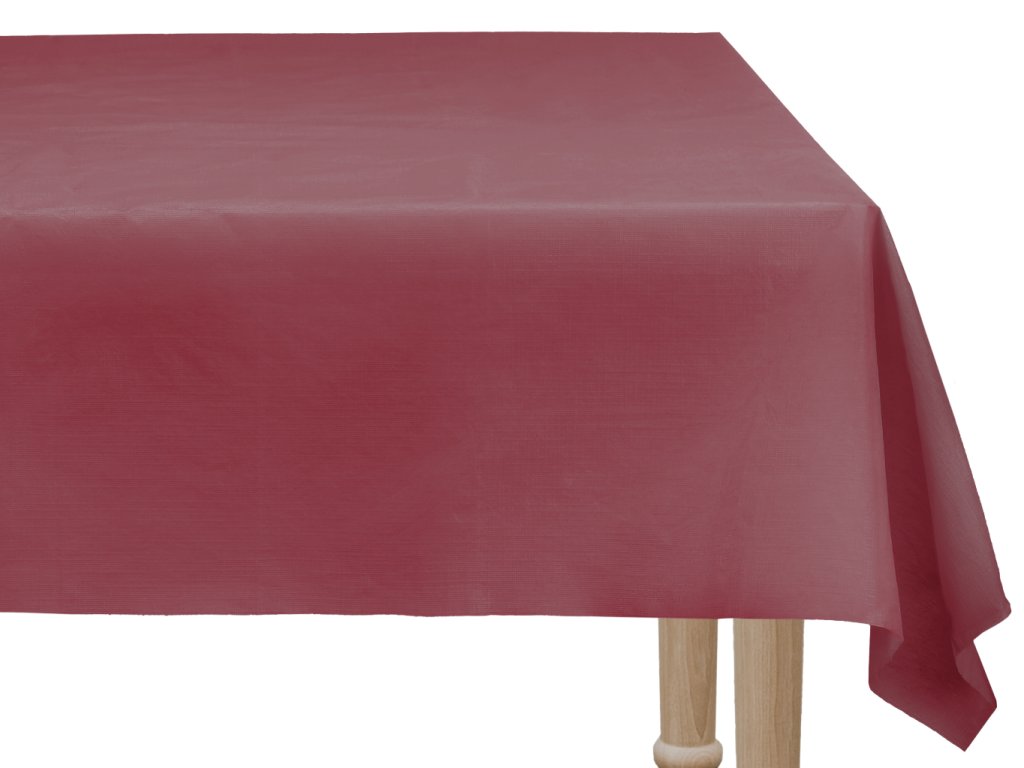 Plastový ubrus v tmavě červené barvě, velikost 137 x 183 cm.