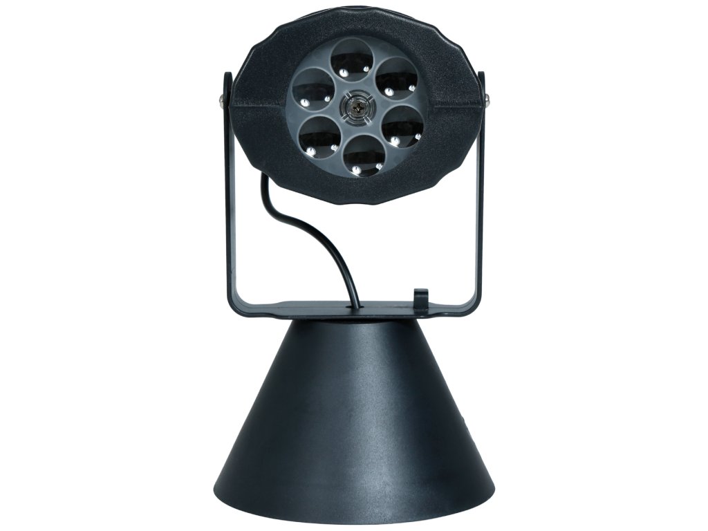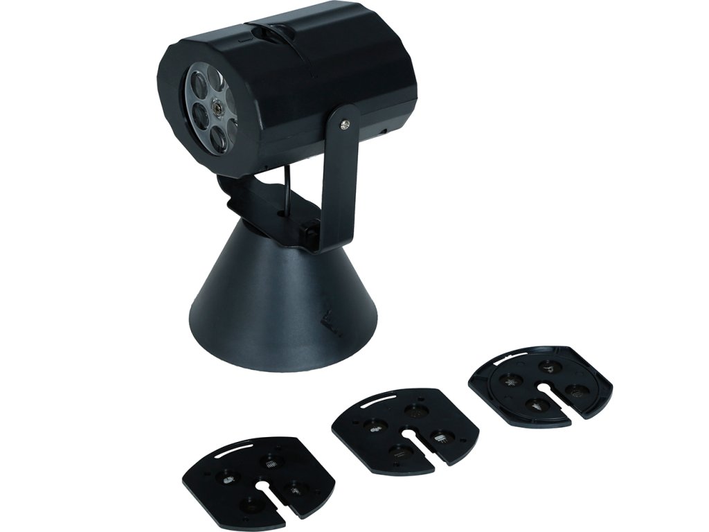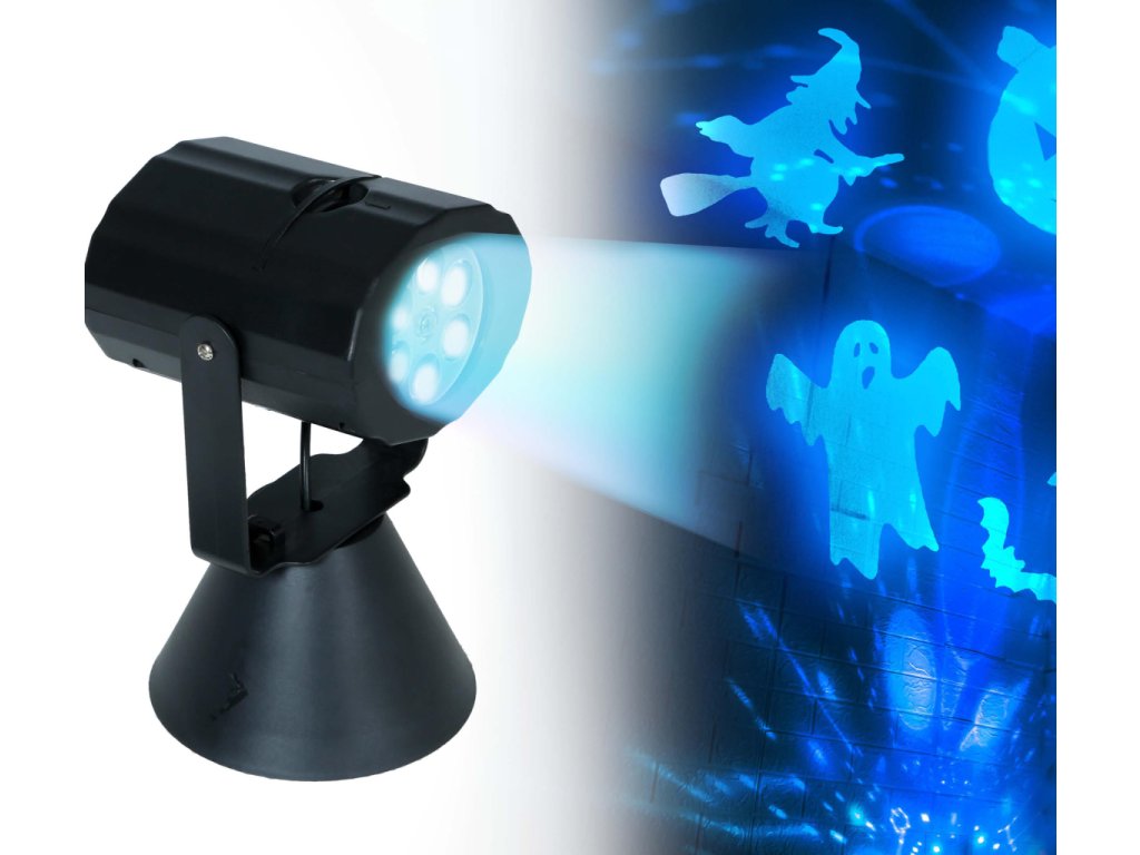 Bezdrátový LED projektor s halloweenskými motivy. Součástí projektoru je základna, která usnadňuje jeho umístění kamkoli a umožňuje promítat halloweenské efekty na stěny, stropy a další plochy. Balení obsahuje 4 diapozitivy s různými halloweenskými motivy. Promítané obrazce se točí dokola.