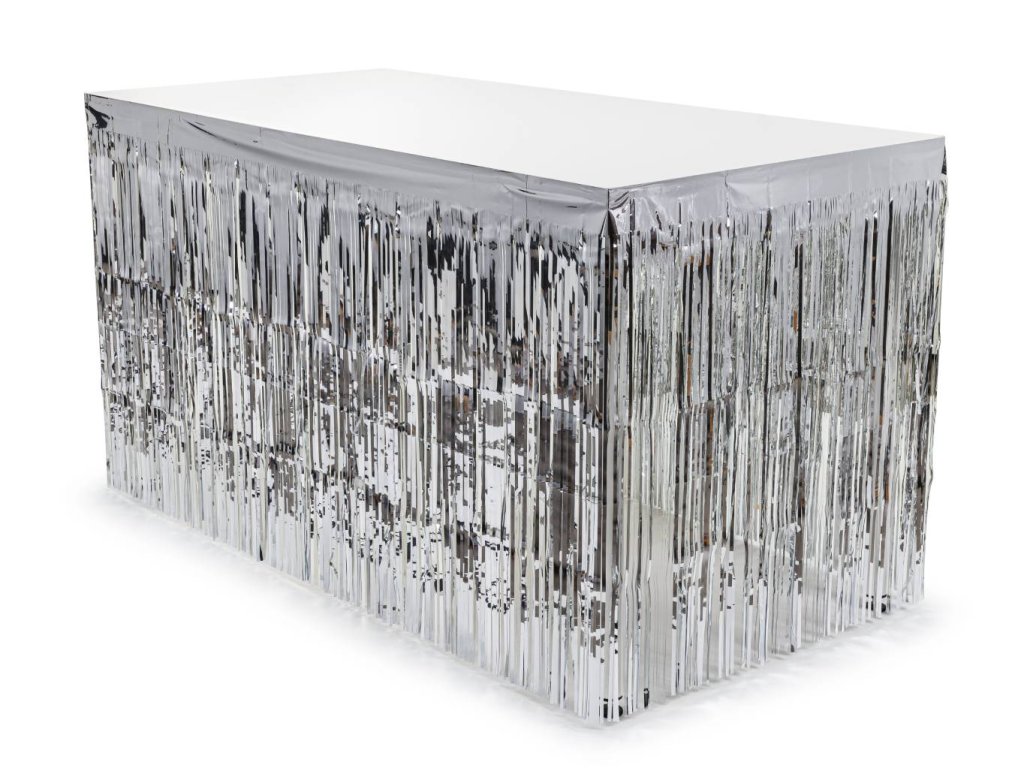 Rautová sukně tvořená fóliovými třásněmi s pevným okrajem v metalické stříbrné barvě, šířka 300 cm, výška 80 cm.