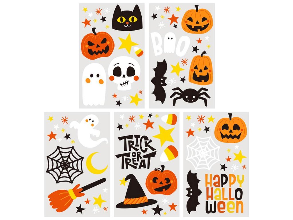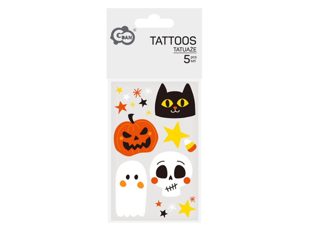 Dočasné tetování s halloweenskými motivy jako jsou duchové, dýně, černá kočka, pavouci, netopýři atd., balení obsahuje 5 archů o velikosti 12 x 7,5 cm.