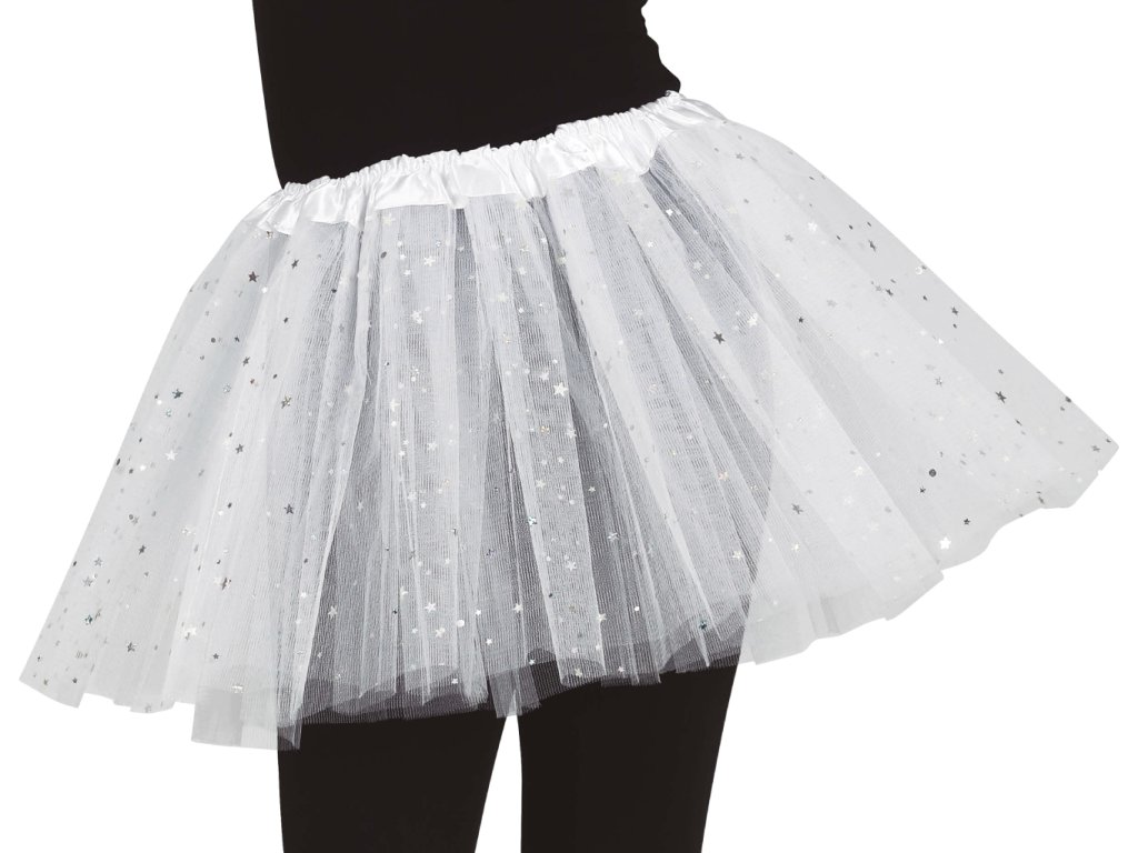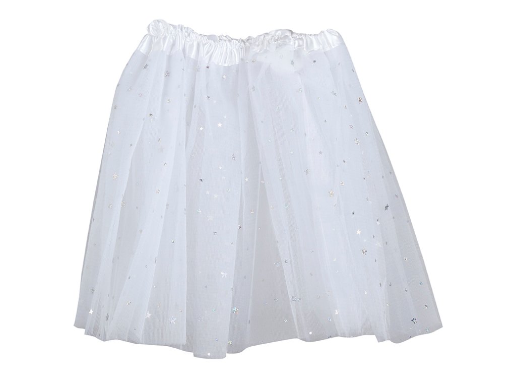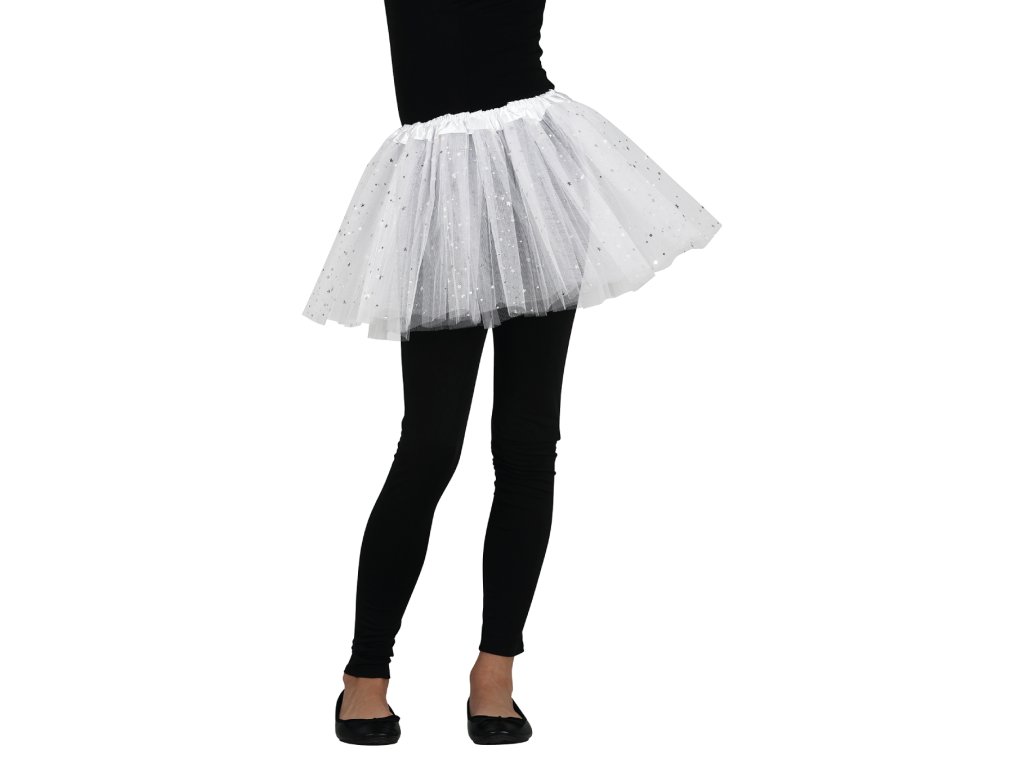 TUTU sukně v bílé barvě vyrobená z tylu zdobená stříbrnými tečkami, v pase na gumu, lehce průsvitná. Obvod pasu 50 cm (pružnost gumy 46 - 80 cm), délka sukně 30 cm.